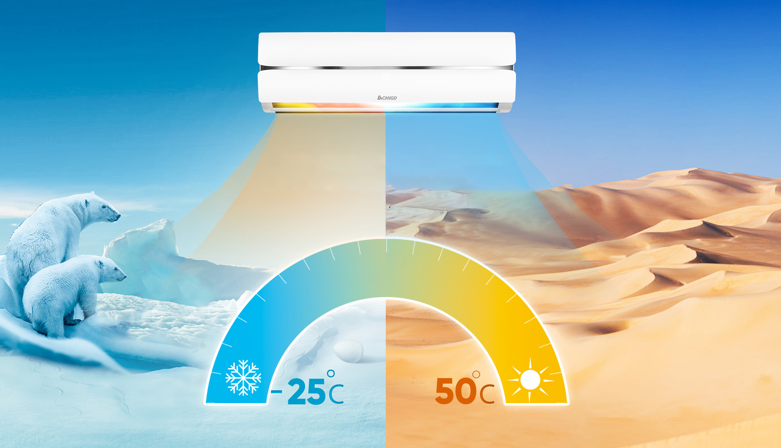 Відсутнє зниження продуктивності кондиціонера в режимі охолодження при температурі навколишнього середовища 50°С. Кондиціонер здатний ефективно працювати в режимі обігріву при температурах зовнішнього повітря до -25°С.